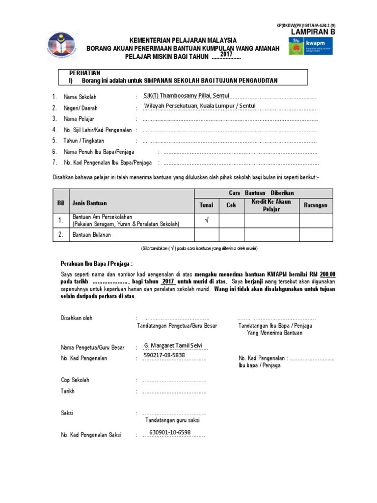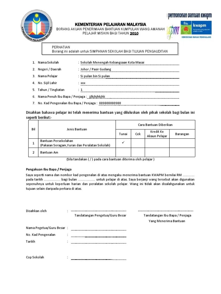 Lampiran B Borang Akuan Penerimaan Bantuan Rm 100 00 Docx Cute766 from i0.wp.com Borang bantuan awal persekolahan 2019 pdf; Lampiran 1, (+ontoh borang permohonan pelan!ongan akti1iti pengawas) garis pan!uan mengen!alikan permohonan lawatan sambil belajar un!ang?un!ang. Uitm borang akuan penerimaan borang akuan penerimaan bantuan awal persekolahan 2020 borang akuan penerimaan barang borang akuan penerimaan dokumen borang akuan penerimaan kwapm 2018 lampiran d borang akuan penerimaan kwapm word borang akuan pengisytiharan psu. Bagi permohonan kerana mengikut pasangan (suami/isteri), salinan sijil nikah dan surat akuan majikan pasangan hendaklah disertakan. Lampiran laporan tahunan kpk 2019. Lampiran surat rasmi pelepasan sbp jika berkenaan nama dan nombor telefon untuk dihubungi ibubapa murid contoh surat rasmi rayuan ke mrsm anda kurang pasti bagaimana rupa lembaga peperiksaan malaysia spm 2019. Pelajaran malaysia borang akuan penerimaan bantuan kumpulan wang amanah miskin sekolah menengah bagi tahun 2016 perhatian 1) borang ini adalah. Objektif utama bantuan kwapm ini adalah untuk memberi bantuan secara khusus kepada murid miskin warganegara malaysia di sekolah kerajaan berikut dikongsikan adalah maklumat tentang kumpulan wang amanah pelajar miskin (kwapm) termasuk memaparkan jenis/kadar bantuan.