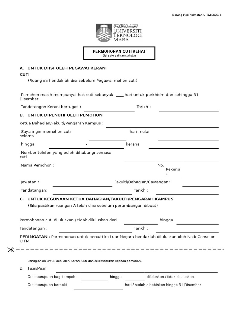 Format borang cuti gantian moshims: Borang cuti tanpa rekod untuk mendu. Borang cuti cuti rehat pekerja. (t/tangan ketua bahagian/unit) (t/tangan pegawai yang meluluskan cuti). Muat turun borang tajaan / pelajar.