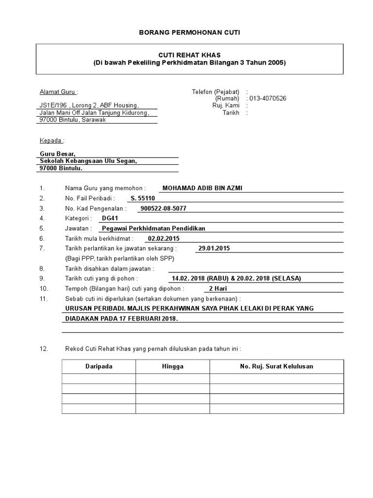 Pemohon telah diberitahu dan cuti telah direkod. Pengiraan cuti rehat atau cuti rehat khas yang boleh dikumpulkan di bawah peraturan 21 (g) catatan cuti terkumpul untuk gcr/gcrk. Baki cuti yang boleh dibawa ke. Borang permohonan cuti rehat copy author: Borang cuti sakit ums these pictures of this page are about:borang cuti sakit. ( diisikan dan ditandatangani ringkas sebelum borang diserahkan kepada pemohon ). (pegawai yang meluluskan cuti rehat). Cuti yang dikumpulkan bagi faedah gantian cuti. Pemohon telah microsoft word 1. 0%0% found this document useful, mark this document as useful. Click on document borang cuti rehat.pdf to start downloading. The file contains 1 page(s) and is free to view, download or print. Text of borang permohonan cuti rehat.