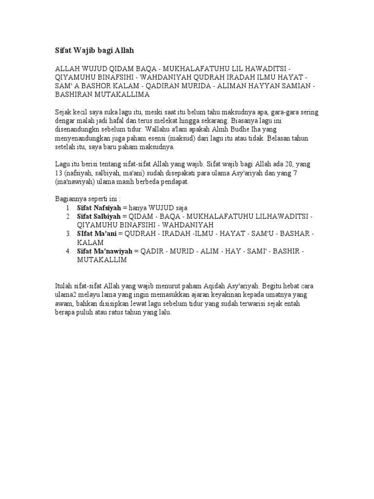 Iradah kauniyyah bisa jadi allah cintai dan tidak allah cintai, sedangkan iradah syar'iyyah pasti allah cintai. Sifat mustahilnya karahah yang berarti terpaksa. Lawan dari sifat iradah ini ialah karahah. Seandainya air laut dijadikan tinta untuk untuk menulis sifat sifat allah tentu kita… Sifat sifat allah syarah wajib bagi setiap muslim mukallaf yaitu yang memiliki akal yang sehat dan sudah masuk dewasa mempercayai bahwa terdapat beberapa sifat kesempurnaan yang tidak terhingga bagi allah.