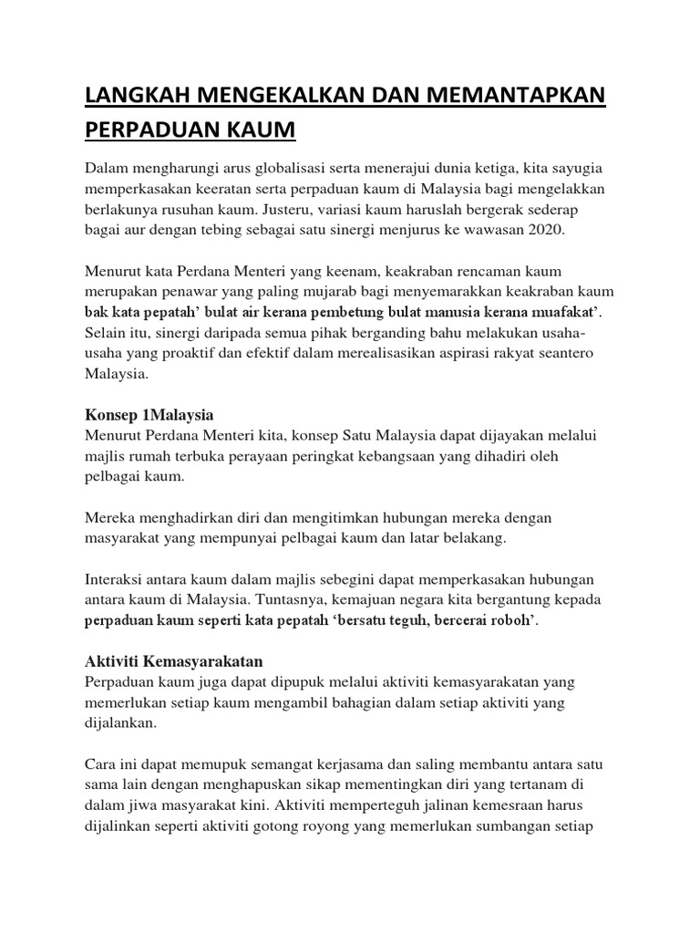 Mar 01, 2015 · langkah ini mempercepatkan lagi perpaduan dan rasa hormoni antara kaum di negara ini. Melaksanakan program kegiatan peringkat sekolah dan antara rancangan intergrasi murid sekolah melibatkan semua kaum untuk perpaduan (rimup) 5. Oleh yang demikian, kerajaan sentiasa meletakkan perpaduan di tempat pertama dan perkembangannya adalah selaras dengan pembangunan negara. Mempelbagaikan komposisi dalam sebuah jabatan/organisasi samada kaum dalam sektor pekerjaan sector awam atau swasta tidak hanya diberi kepada kaum tertentu sahaja 4. Dec 09, 2019 · tegasnya, perpaduan kaum adalah penting untuk mengekalkan keamanan negara agar kemerdekaan negara kita dapat dikekalkan.